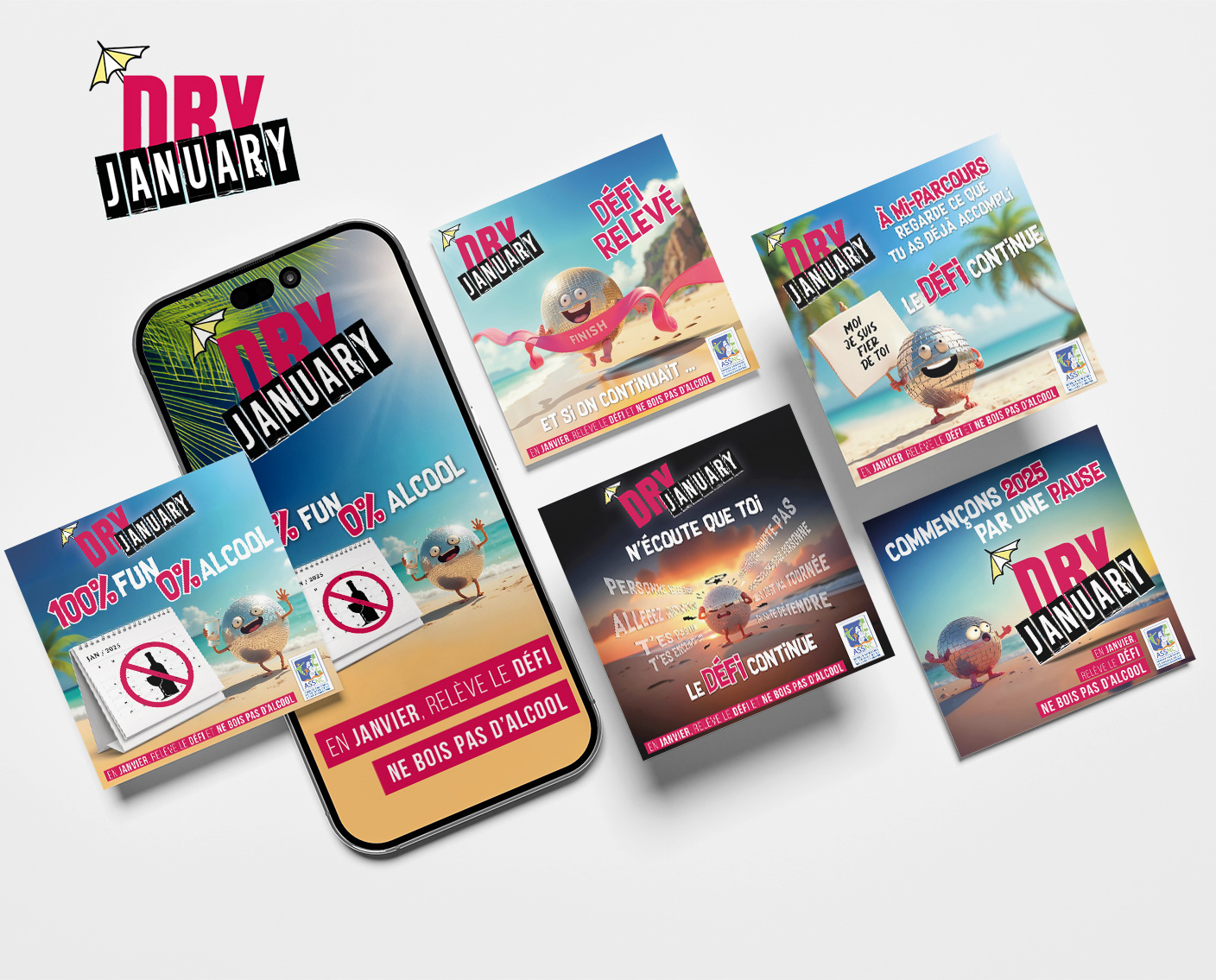 Création univers estival et d’une mascotte symbolisant la fête et les vacances d'été (janvier-février en NC) pour convaincre la cible de faire le Dry-January.