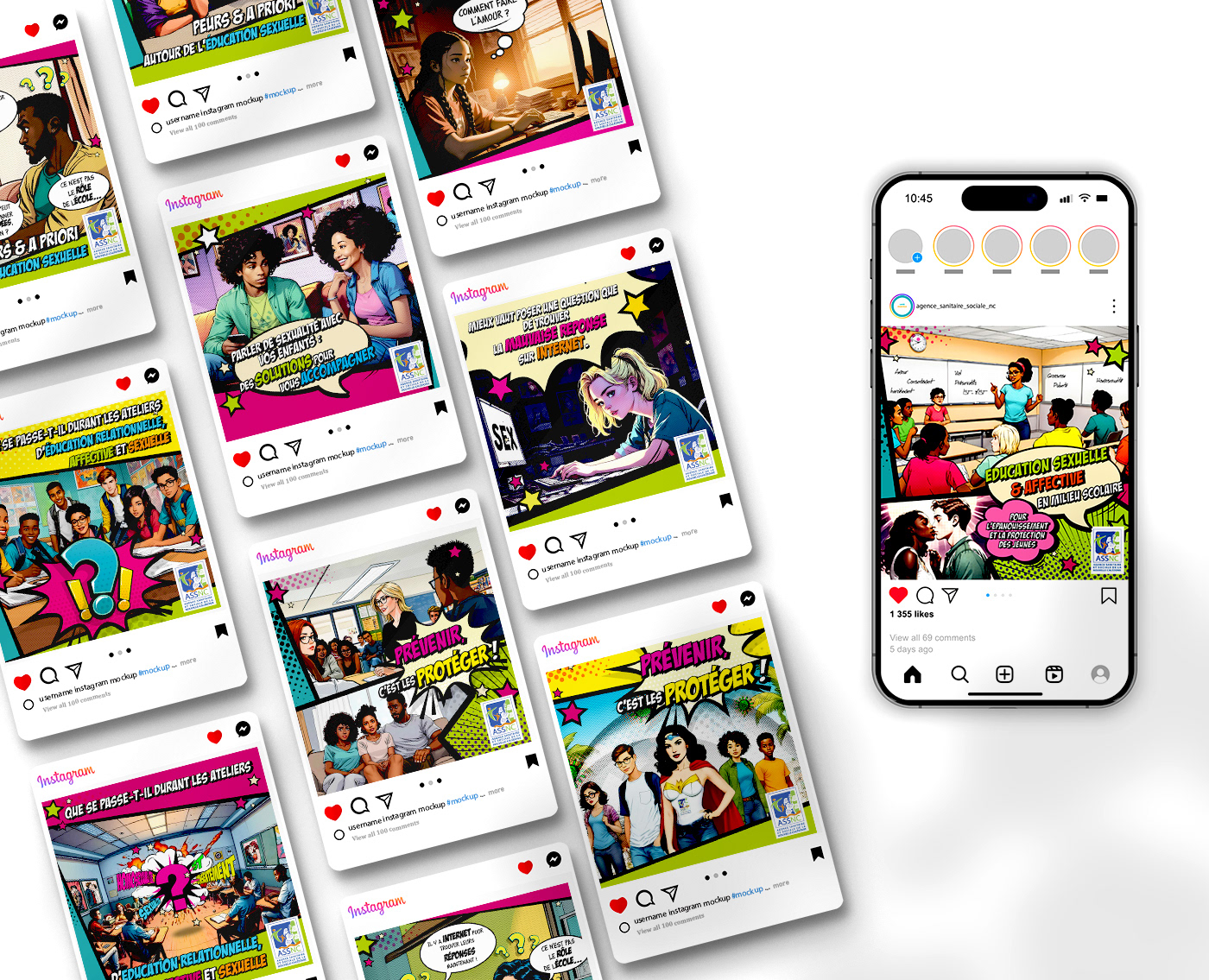 Création d’une identité graphique vintage inspirée du pop art et des comics. Cet univers coloré et dynamique où se mêlent imagination et valeurs humaines. Les personnages y incarnent la jeunesse calédonienne et ses parents, dans un style graphique expressif qui capte l’attention et qui se veut rassurant par les valeurs qu’il véhiculent. Création d’un storytelling autour des idées reçues et des interrogations des élèves et des parents.