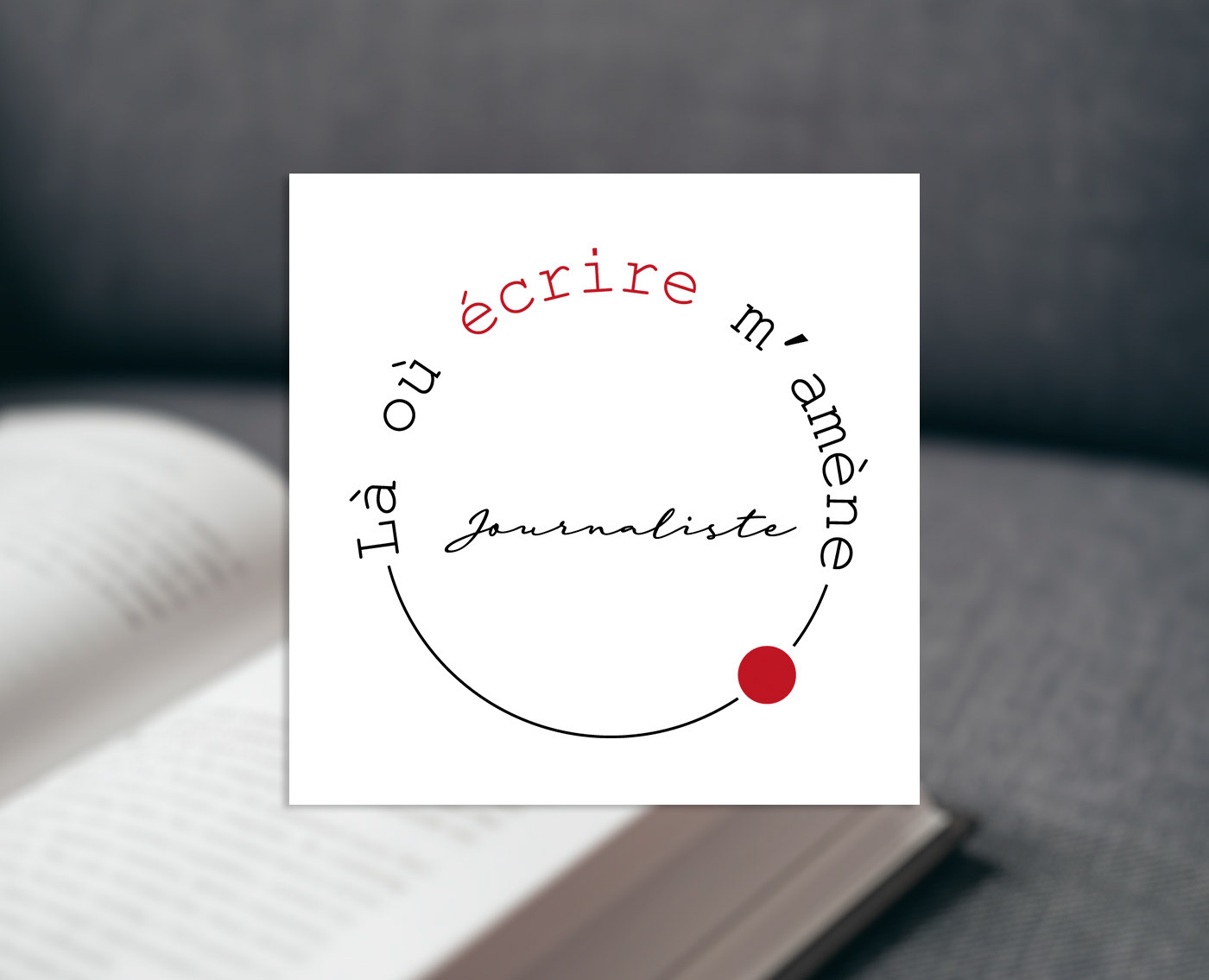 Le cercle symbolise le chemin du journaliste, tandis que le point rouge marque la destination, la passion et l’intensité des mots.