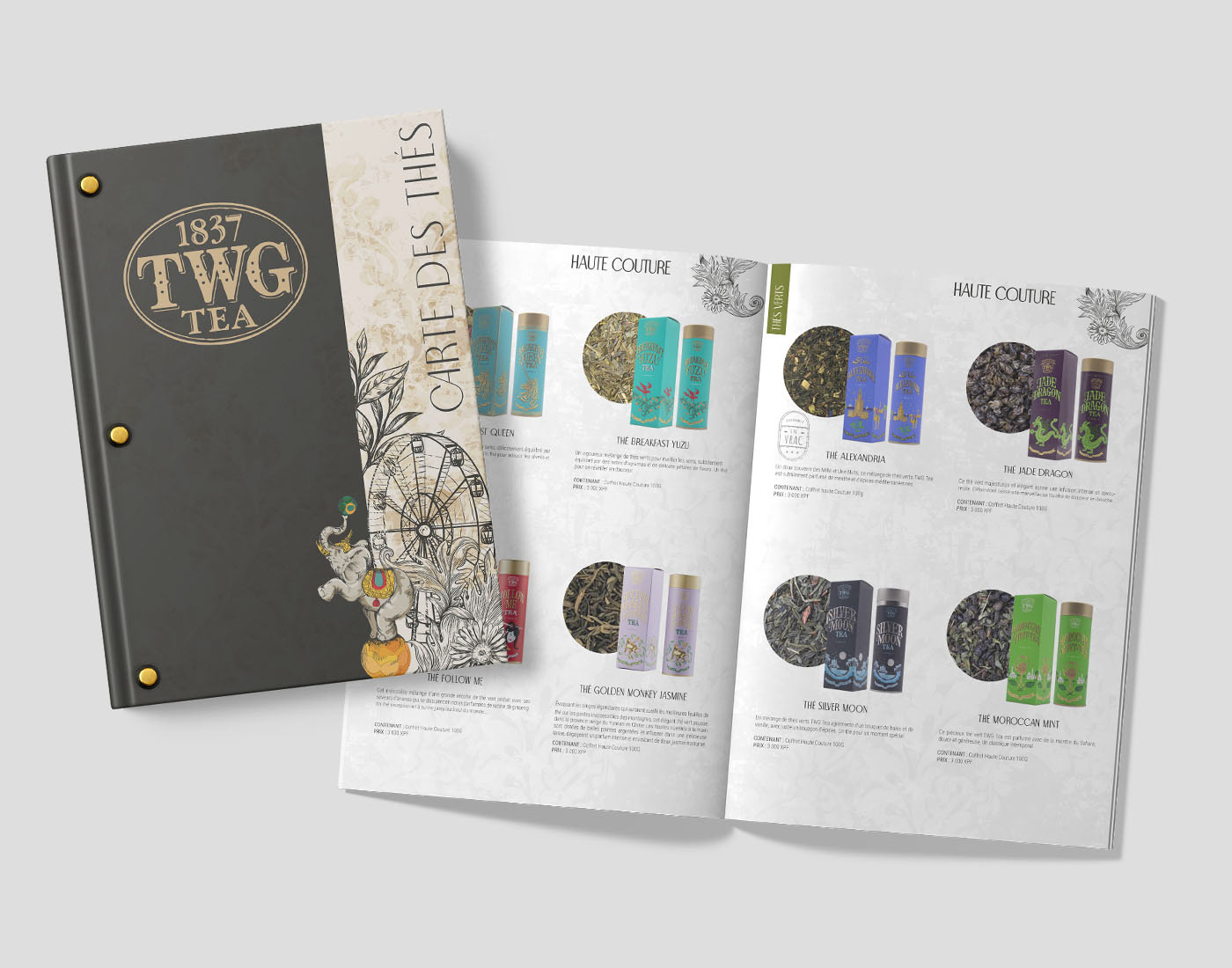 Création d’une carte des thés raffinée et élégante, inspirée de l’univers du luxe et du voyage. La mise en page harmonieuse et les illustrations délicates valorisent l’identité haut de gamme de la marque.